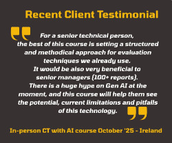"For a senior technical person, the best of this course is setting a structured and methodical approach for evaluation techniques we already use. It would be also very beneficial to senior managers (100+ reports). There is a huge hype on Gen AI at the moment, and this course will help them see the potential, current limitations and pitfalls of this technology".